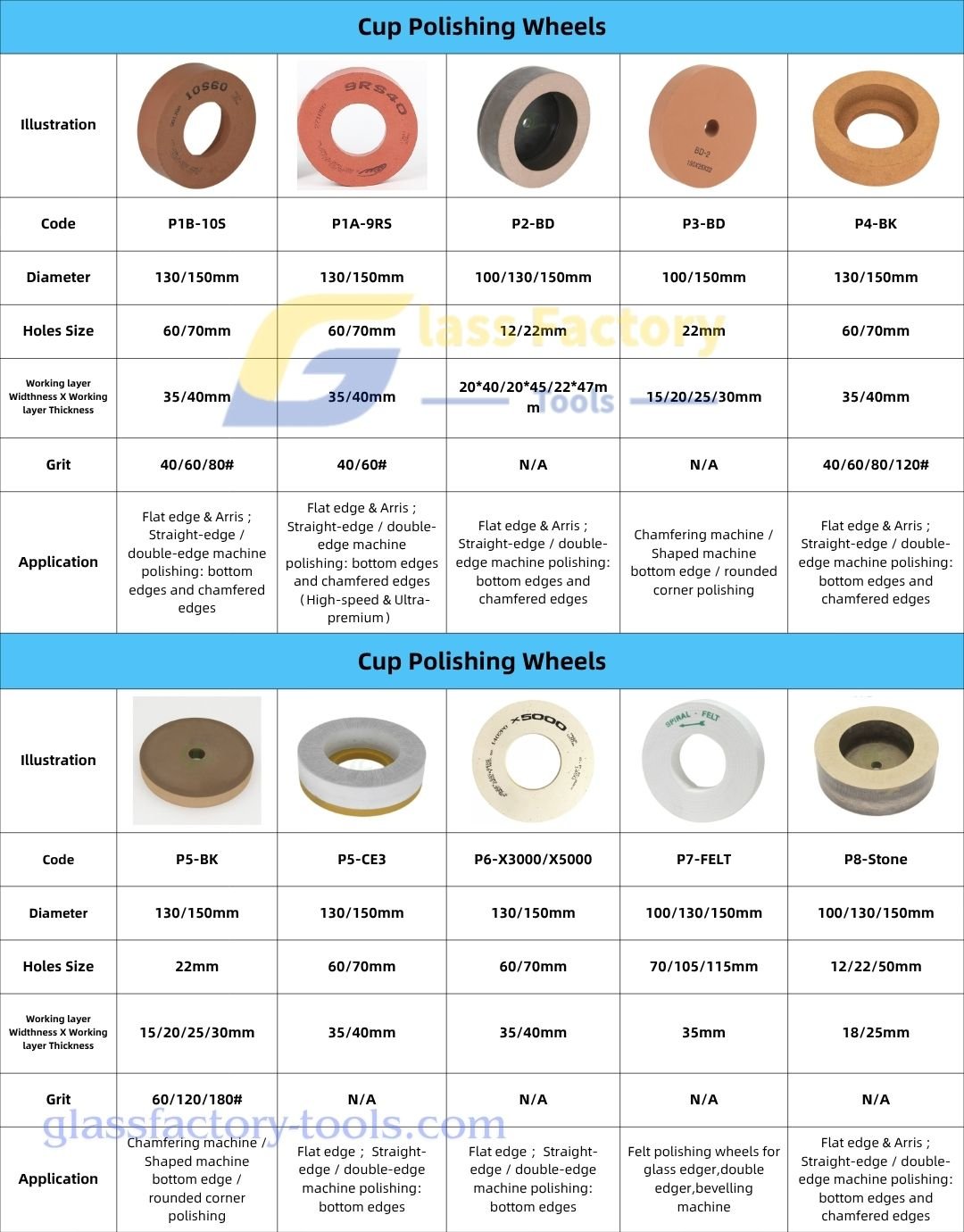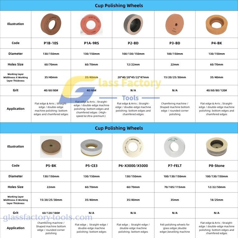 We specialize in supplying diamond wheels, resin wheels, and polishing wheels for professional glass factories and ceramic/tile factories. Our wheels are engineered for high-efficiency production on glass, ceramic tile, and sintered stone, supporting common applications such as edge grinding, chamfering, grooving, peripheral grinding, and surface finishing on CNC edging machines and other glass/ceramic processing equipment. With a wide range of wheel profiles (flat, bevel, pencil edge, bullnose, V-groove, and more), multiple size options, and stable performance for long service life, we help manufacturers achieve consistent quality and productivity. Custom specifications are available upon request to match your exact machine and processing requirements.